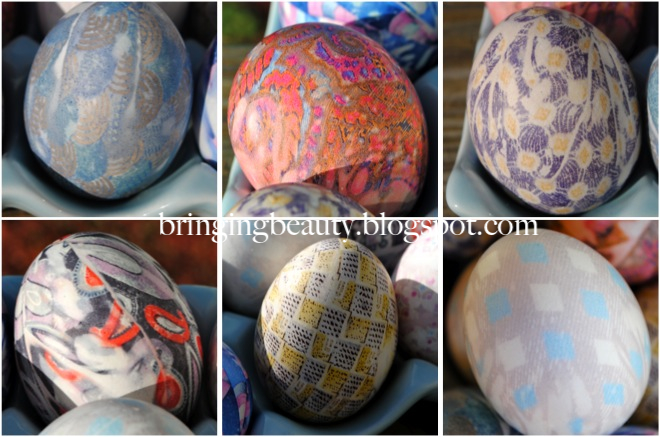 Carefully remove the eggs with tongs and set them aside to cool. Once they have completely cooled you can take off the cloth to see how they turned out!